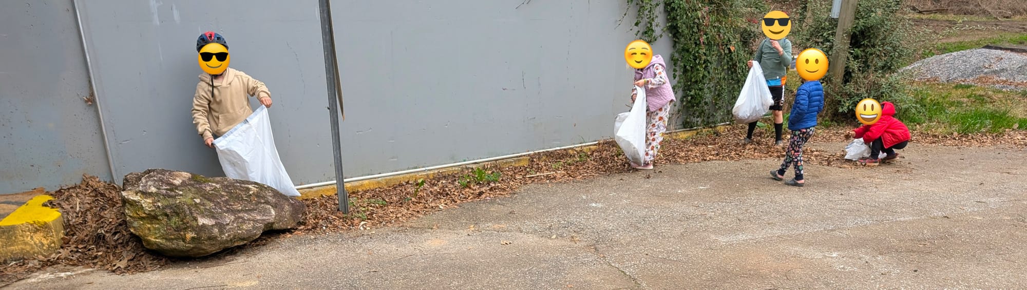 The countdown began: three, two, one... go! They raced against the clock, filling up their bags with leaves from edges of the Springer St Tunnel (that's where the best caches of leaves could be found). And when the timer ran out, they piled together their individual bags into one extra large trash bag, filling it completely!