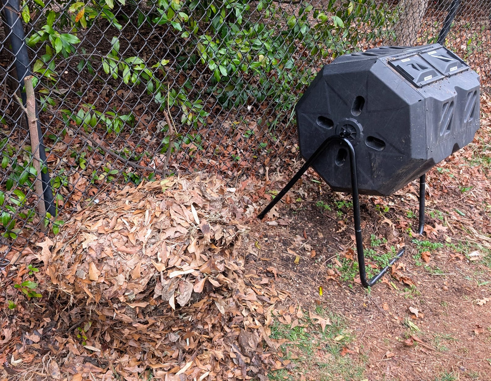 Since the neighbors refreshed the garden last December, the garden's compost barrel has been diligently maintained and filled with food scraps. One of the new rules for the updated system has been to match food bits with equal parts of leaves (this assists the composting process and masks the smell). Until now, there have been enough surrounding leaves on the ground from last fall ― but suddenly the adjacent leaf supply ran dry.